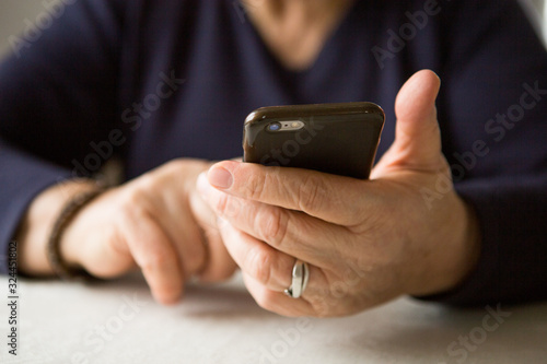 Retired woman is using mobile phone, at cozy home kitchen. Grandmother has coffee break in cooking. Senior person is looking for recipe, communication online in the internet. Authentic moment.