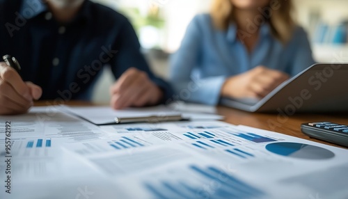 Retirement savings being reviewed by a financial advisor and clients, organized style, sharp focus, soft lighting, high detail