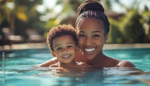 Retrato em close-up de uma mãe afro-americana feliz e seu filho pequeno se divertindo em uma piscina em um resort