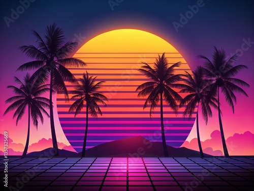 Retro 80s Synthwave Sunset Landscape - Vibrant Gradient Sky and Palm Trees