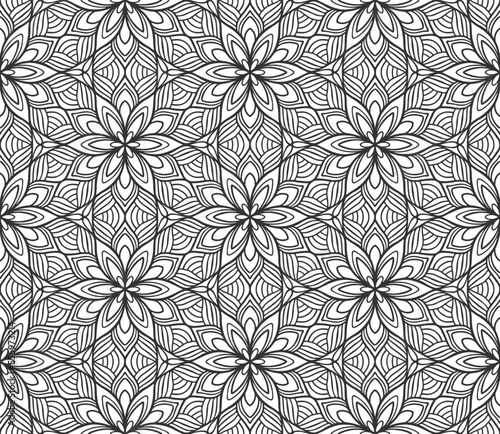 Retro abstract flower seamless pattern. Wrapping paper flat botanical design. Textile herbal ornament. Monochrome ornate background. Lace elegant fabric decor. Vintage geometric foliage backdrop