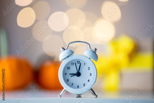 Retro alarm clock with pumpkins and gift box near Fairy Lights