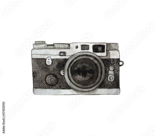 Retro black camera, watercolor illustration of the object isolated on a white one
