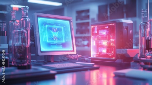 Retro Computer And Server In A Futuristic Laboratory Setting With Neon Lighting And Glowing Screens. Displaying Colorful Neon Lights, Such As Blue, Pink, And Purple. High Tech Workspace With Glass