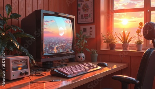 Retro computer scene with old CRT monitor, sunset view through the window, and vintage feeling