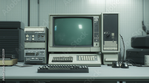 Retro Computing Setup: A vintage computer workstation, featuring a CRT monitor, keyboard, and various peripheral devices, evokes a nostalgic feel of early computing.