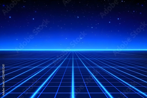 Retro Futuristic Glowing Grid Landscape Extends Under a Starry Night Sky with Abstract Background