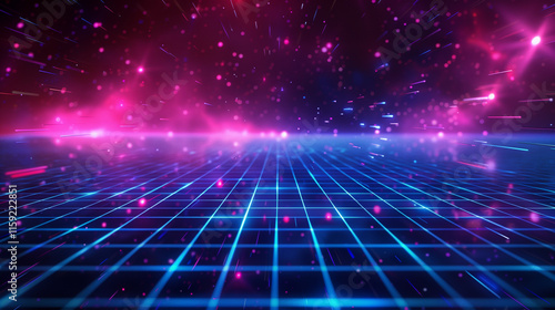 Retro futuristic neon synthwave wireframe net extending into the horizon with glowing pink and blue lights