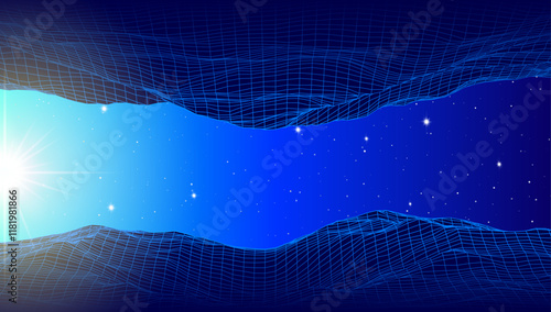 Retro low poly grid landscape with polygonal mountain, palm trees silhouettes and sun, vector illustration. 80s style synthwave landscape with neon grid mountains, palm trees silhouettes and sun.