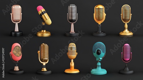 Retro Microphone Collection: A 3D Render of Vintage Recording Devices AI Generated