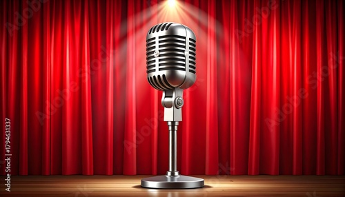 Retro microphone stands center stage before red drapes, illuminated by a single spotlight creating dramatic shadows
