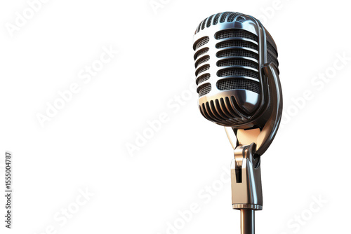 Retro microphone with shiny metallic finish stands on a clear surface against a transparent background, perfect for music, events, or broadcasting in any setting