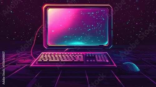Retro Neon Computer in Cosmic Space with Vibrant Colors