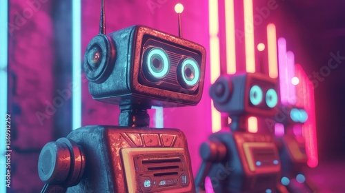 Retro Robot Characters with Neon Lights in Futuristic Setting
