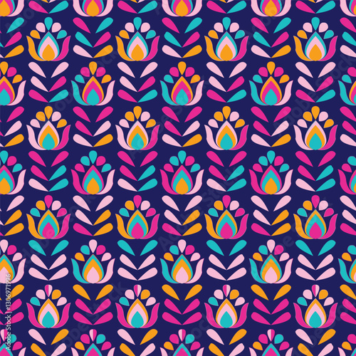 Retro seamless pattern with floral elements in scandinavian style. Geometric stylized flowers, 60s, 70s. surface design, fabric, paper, stationery.