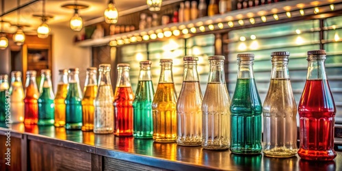 Retro Soda Fountain Nostalgia with Classic Glass Bottles, Vintage Aesthetic, Minimalist Style, Timeless Refreshments, Retro Decor, Whimsical Design, Nostalgic Vibes, Classic Beverage Experience