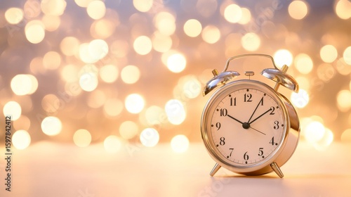 Retro style alarm clock is ringing on a blurred golden bokeh background, symbolizing the countdown to midnight on new year's eve, creating a festive and celebratory mood