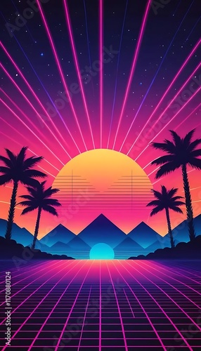 Retro Sunset Scene With Palm Trees And Grid Lines