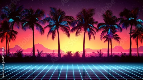 Retro sunset scene with palm trees and neon grid.