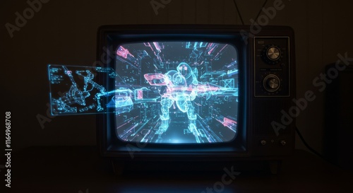 Retro television displaying futuristic hologram of a robot warrior in neon colors