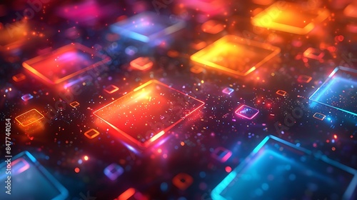 Retro-inspired rectangles with rounded corners, vibrant neon colors, dark background, hd quality, digital art, high contrast, geometric precision, modern design, artistic composition, dynamic.