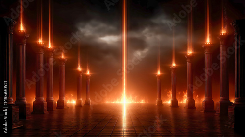 Revelation vision scene: seven golden lampstands, stars falling, the Lamb of God glowing on a throne, thunderclouds and fire, apocalyptic.