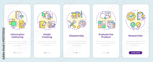 Reverse engineering process onboarding mobile app screen. Walkthrough 5 steps editable graphic instructions with linear concepts. UI, UX, GUI template. Montserrat SemiBold, Regular fonts used