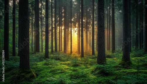 Rewilding forest area, new growth among old trees, biodiversity restoration, vibrant greens