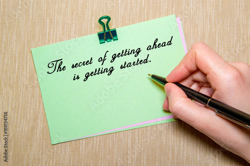 rgeen paper with paperclip and woman hand holding a pen about to write. Objects isolated on yellow. The secret of getting ahead is getting started.