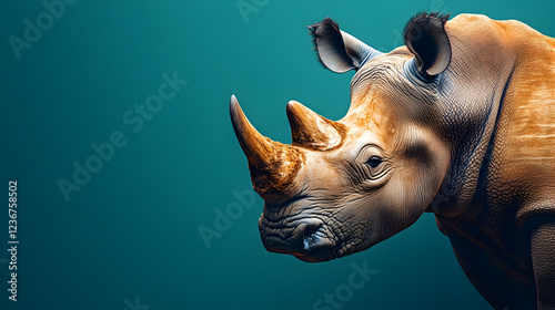 Rhinoceros in profile against a solid green background exuding strength majesty and confidence ultra-detailed high-quality studio portrait with a powerful and commanding presence