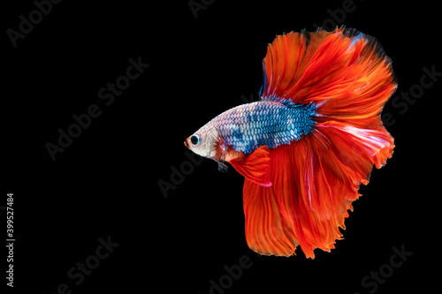 Rhythmic of betta splendens fighting fish over isolated black background. The moving moment beautiful of orange siamese betta fish with copy space.