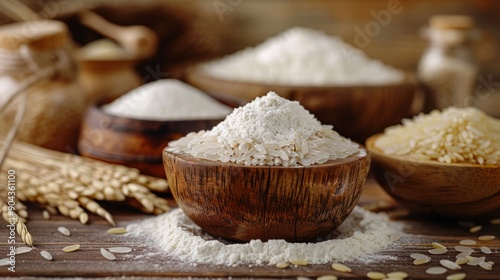 Rice flour and white rice displayed on rustic wooden table with natural elements