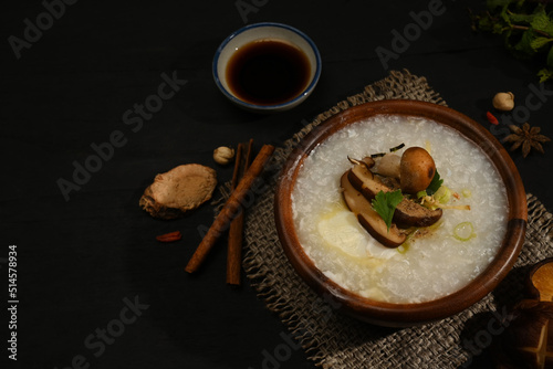 Rice porridge, rice gruel or congee with shiitake mushroom, boiled egg ,sliced ginger and slice scallion on black wooden table for breakfast