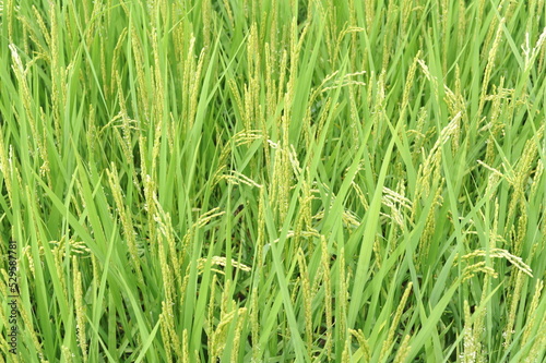 Rice seed and culms, straw in geometrical patterns of lush green rice fields and rice paddies in Japan in summer