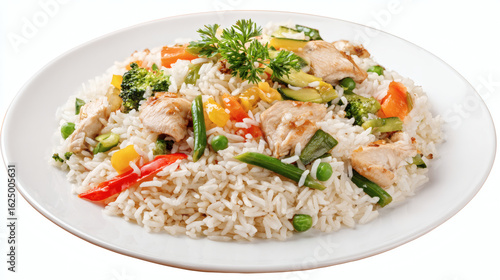 Rice with vegetables and chicken, healthy meal plate, isolated on transparent background