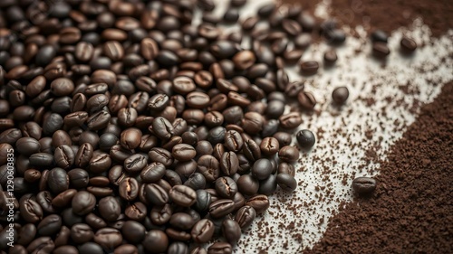 Rich coffee beans spread across a textured surface with freshly ground coffee adding depth and dimension, spread, industry, caffeine