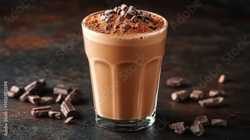 Rich, decadent chocolate smoothie in a glass. Topped with cocoa powder and chocolate chips