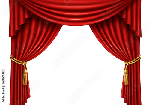 Rich red stage curtains with opulent gold cords and tassels against a dramatic black background.