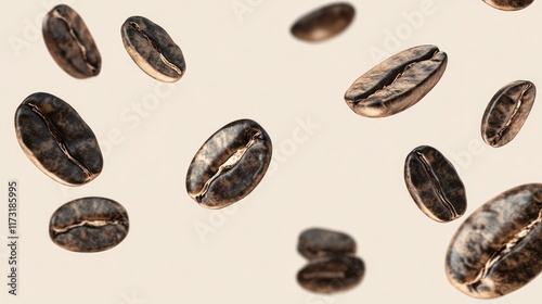 Richly textured coffee beans floating in mid-air against a soft beige background, capturing detail