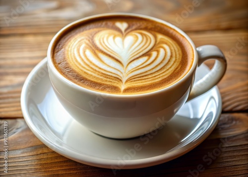 Richly textured, velvety latte art features an intricate heart design, adorned with swirling patterns and delicate foam, resting in a elegant white ceramic cup.