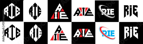 RIE letter logo design in six style. RIE polygon, circle, triangle, hexagon, flat and simple style with black and white color variation letter logo set in one artboard. RIE minimalist and classic logo