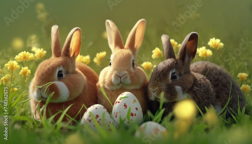 rio of bunnies amid grass and flowers with speckled Easter eggs in the foreground - Generative AI