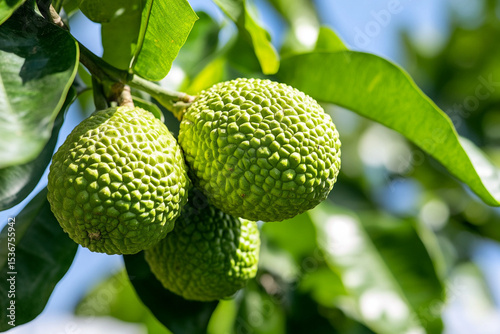 Ripe breadfruit hanging from tree branches in bright sunlight