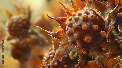 Ripe brown horse chestnuts with a prickly shell are shown up-close against an autumn background.