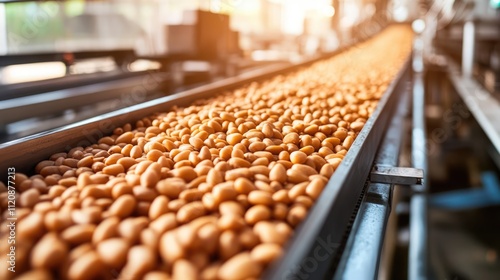 Ripe brown pine nuts in shell on conveyor belt in organic food processing factory showcasing industrial production methods
