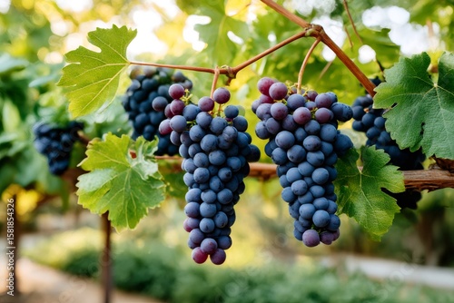 Ripe bunches of red grapes hanging from vine in vineyard