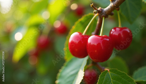 Ripe cherries hanging on a tree branch in a lush garden, Red juicy cherries, Cherry picking