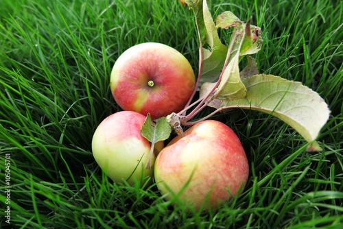 Ripe cultivar apples with leaves on the lawn in the autumn garde
