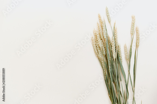 Ripe ears on pastel minimal background. Flat lay, top view, copy space