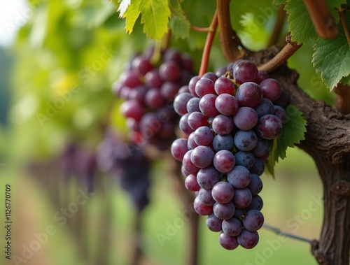 Ripe, juicy grapes hanging from a vine in a vineyard